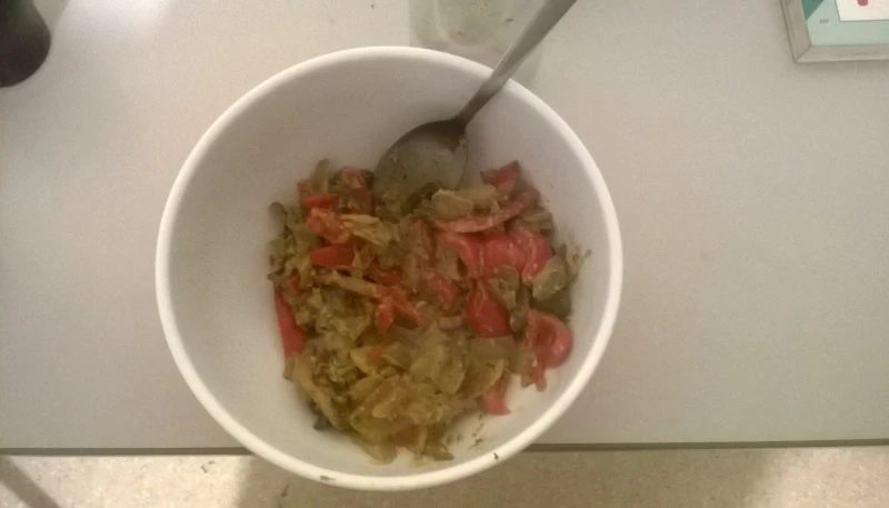 Coupez les poivrons et les oignon et faites les revenir dans une poêle anti adhésive avec un peu d'eau et sauce soja.