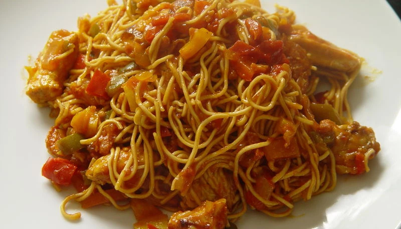 Quand les nouilles sont prêtes, les essorer, et les ajouter à la poêle avec la viande et les légumes, ajouter de la sauce soja à volonté.