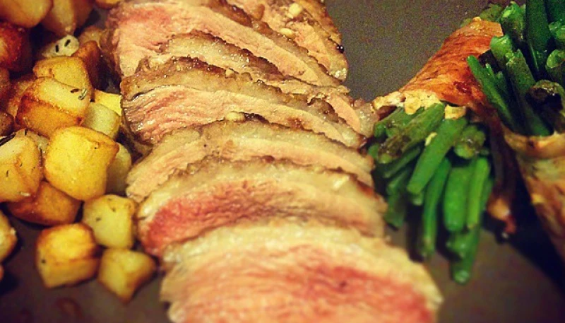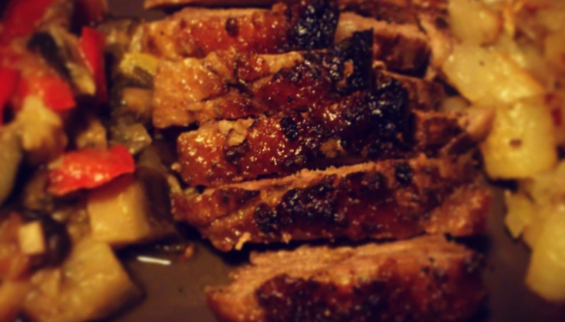 - Lorsque le le canard est prêt (il doit demeurer rosé à coeur), émincez le, et confectionnez une belle assiette avec vos pommes de terre rissolée, la ratatouille, et quelques émincés de filet.