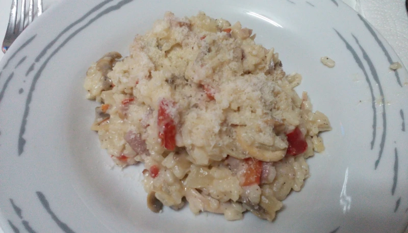 Pendant que le riz cuit, faites revenir dans une poêle huilée le poivron, les champignons et les lardons.