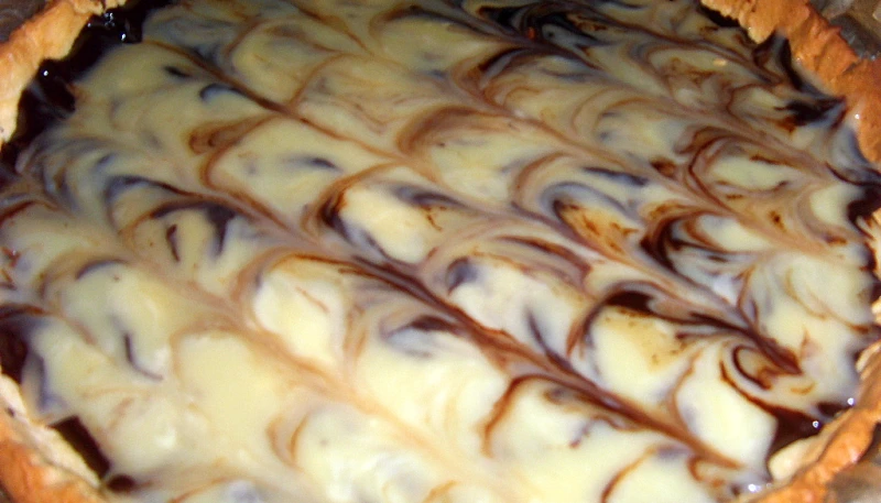 Versez la ganache de chocolat noir dans le fond de tarte et répartissez la bien sur toute la pâte. Ensuite versez délicatement par dessus le chocolat blanc.