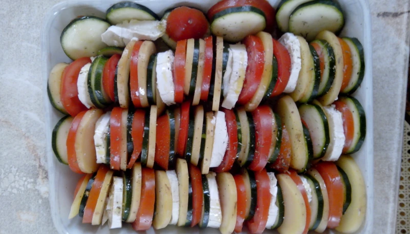 Coupez la courgette, les tomates, le fromage et les patates en rondelles de même taille ( je conseille l'usage d'une mandoline pour vous faciliter la tache)