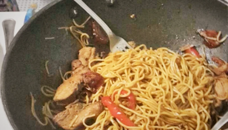 En même temps fait chauffer dans une casserole de l'eau chaude, une fois que l'eau boue, retire là du feu et met les nouilles. Laisse les cuire 5 minutes. Puis vide l'eau et met les nouilles dans le wok, laisse revenir à feu vif pendant 1 ou 2 minutes avec le reste de la marinade.
