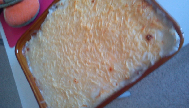 7. Couvrez votre plat de viande-ratatouille avec la béchamel toute prête. Etalez bien celle-ci.