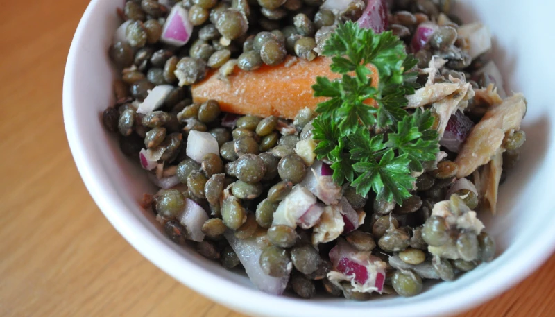 Dans un plat unir le thon, les lentilles, les oignons, un peu de persil et un peu d’huile pour que le plat ne soit pas sec.