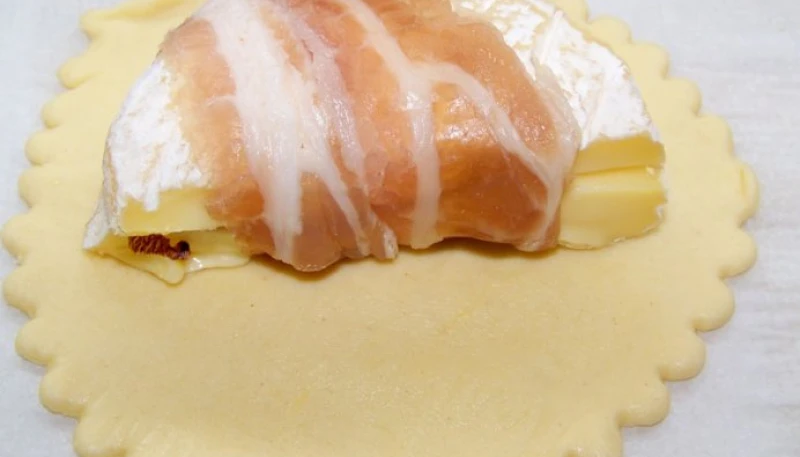 3- Déposez dans chaque quart de pâte feuilletée un Saint Marcellin enrobé de jambon,