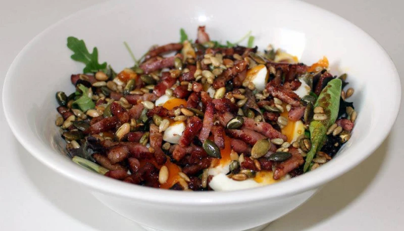 8 – Ajouter les lardons et le mélange de graines légèrement grillées puis la vinaigrette.