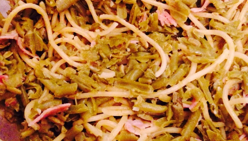 Couper les haricots verts en petits morceaux et les faire revenir à la poêle avec un peu de beurre, une gousse d'ail hachée et le jambon coupé en petits bouts.