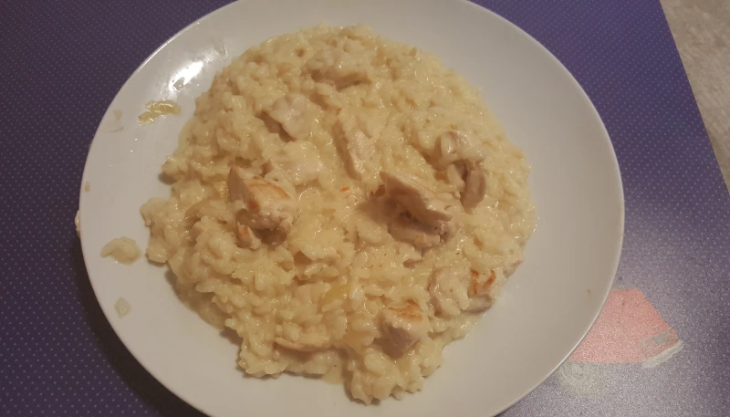 - Verser la crème dans la poêle, m"langer quelques secondes, puis ajouter le riz égoutté et mélanger à nouveau, jusqu'à que le riz est absorbé la crème.