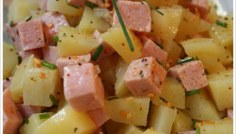5- Dans un saladier, mélanger les pommes de terre, les tomates cerises, ajouter les dés de Jambon, la mozarella et quelques cerneaux de noix.