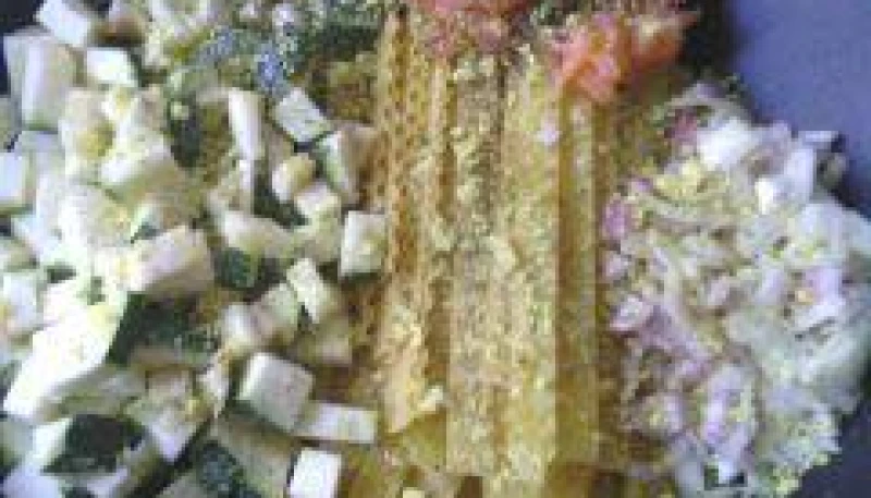 Laver et couper la courgette en brunoise (cubes). Éplucher et émincer l'oignon et l'échalote. Tailler en petits morceaux les tranches de saumon.