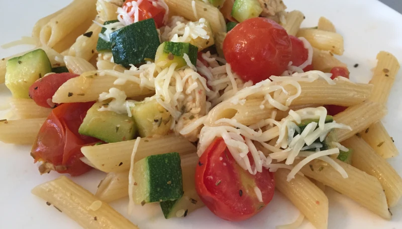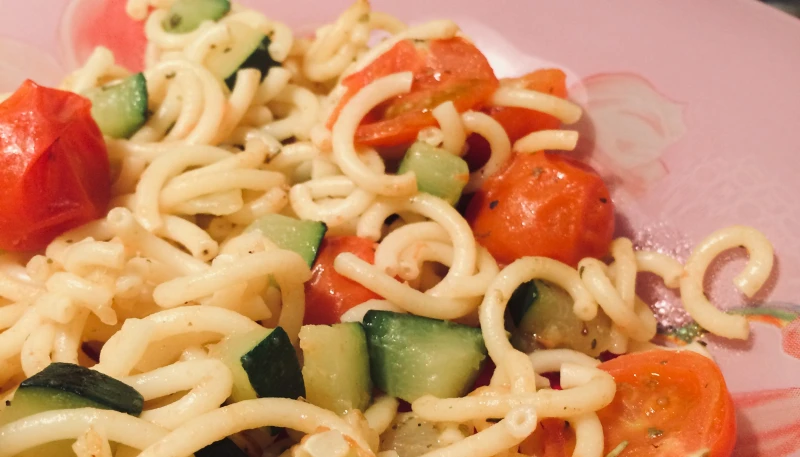 NB : concernant le prix. Lorsque j'ai fait cette recette chez moi, j'ai payé la courgette 76 centimes, les tomates cerises (françaises), 1€, et le poulet pour deux personnes à environ 3€.