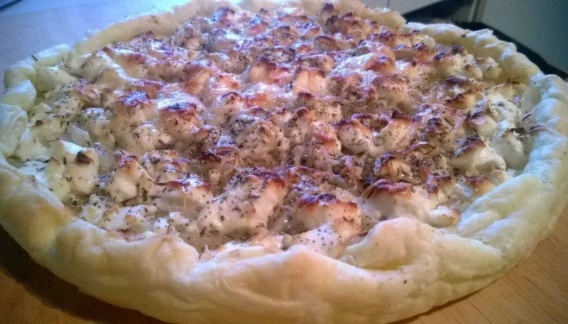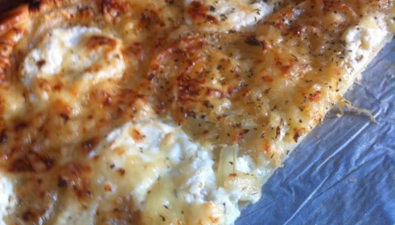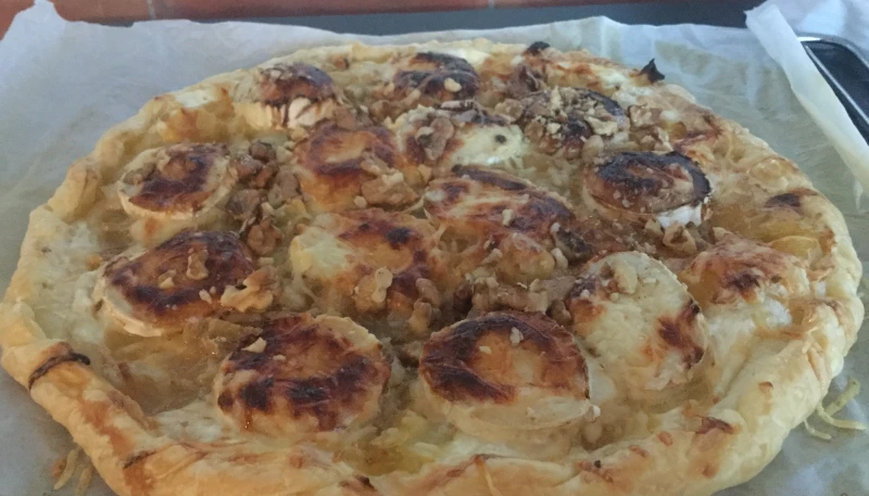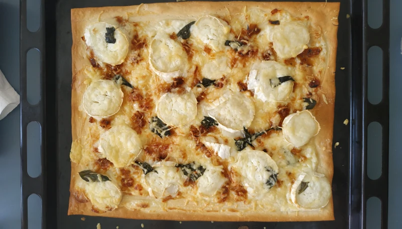 Repartir de la crème fraîche sur la pâte, y ajouter les oignons puis recouvrir de morceaux de chèvre frais. Terminer par une couche de gruyère et enfourner pendant 10-15 minutes !