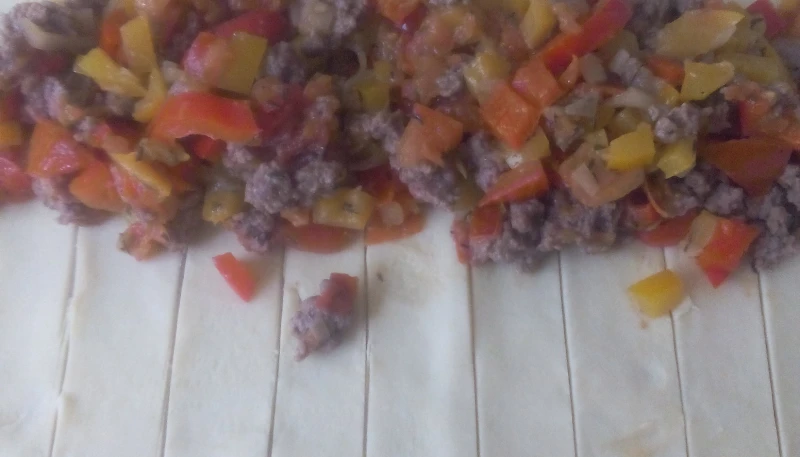Couper la pâte en bandes de 5/6 cm de largueur mais en laissant un espace au milieu (voir photo).