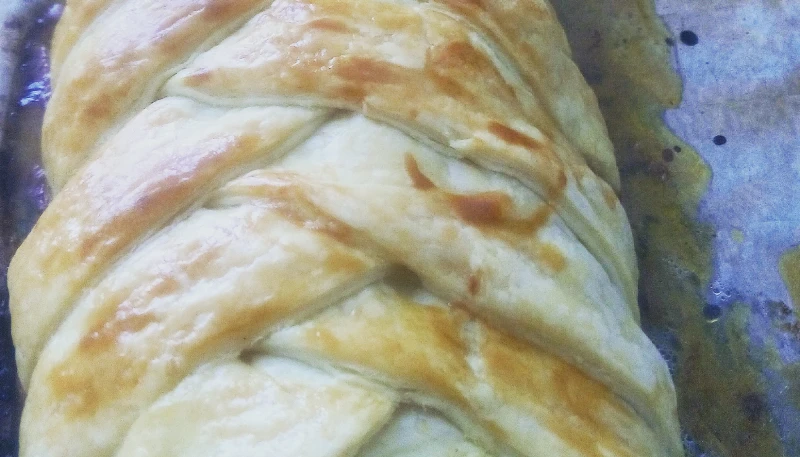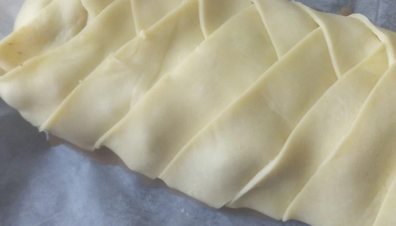 Rabattre les deux bords puis toutes les bandes en diagonales pour fermer le feuilleté. Le badigeonner de jaune d’œuf.