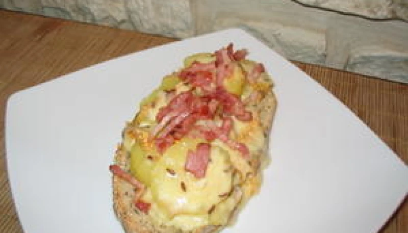 Tartiner avec la moutarde (si vous voulez frotter une gousse d'ail sur le pain avant cette étape c'est possible et tout aussi bon), puis garnissez avec les pommes de terre, lamelles de jambon, puis fromage.