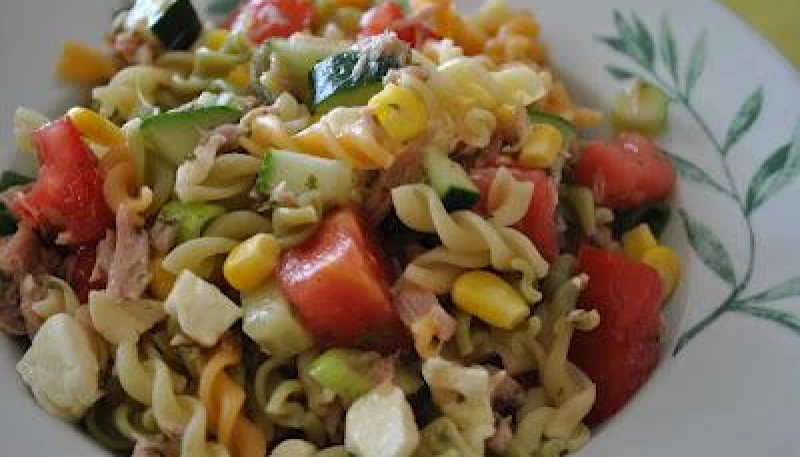 (Ne pas oublier de faire cuire les pâtes, à vu d’œil, al dente ou non selon vos goûts) Mettre les légumes dans un saladier, ajouter le thon émietté et le mais.