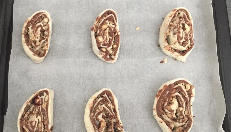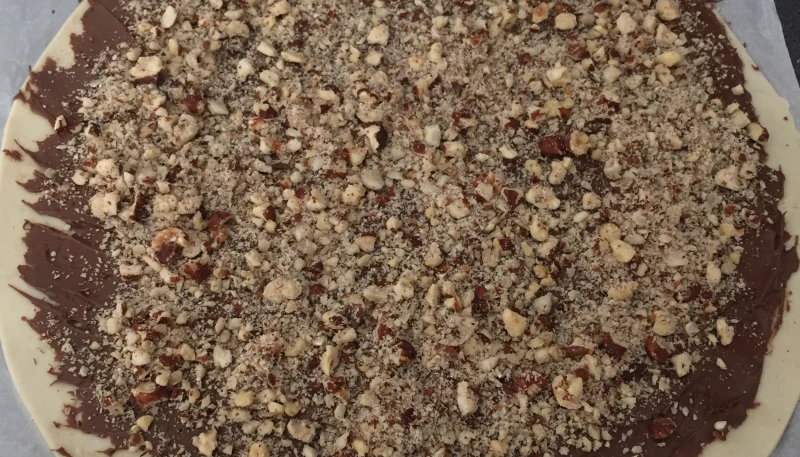 Commencez par dérouler la pâte feuilletée. Étalez dessus une généreuse couche de Nutella. Répartissez les noisettes concassées.
