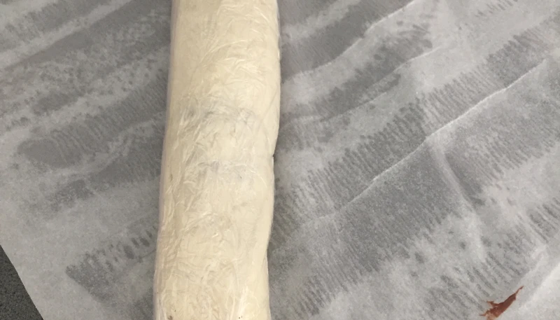 Enroulez la pâte sur elle-même pour former un boudin. Placez-le dans du film alimentaire puis réservez-le 10min au congélateur, pour qu'il durcisse un peu et soit plus facile à découper (si vous n'avez pas de congélateur, 30min ou 1h au frigo devrait faire l'affaire).