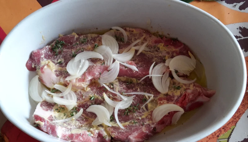 Disposez les oignons sur les côtes et dans tout le plat. Faites de même avec le thym. Rajoutez un peu d'huile d'olive par dessus.