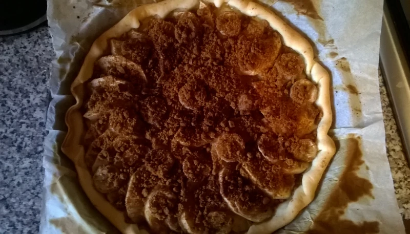 Émietter des spéculoos et en disposer la moitié sur le fond de la tarte, puis les rondelles de pomme et de banane. Enfin saupoudrer du reste de spéculoos.