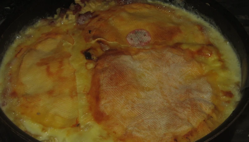 3. Lorsque les crozets sont cuits, couper le reblochon dans sa largeur (vous obtiendrez deux disques). Mettre les crozets, l'oignon, les lardons, la crème dans le plat et recouvrir des disques de reblochon.
