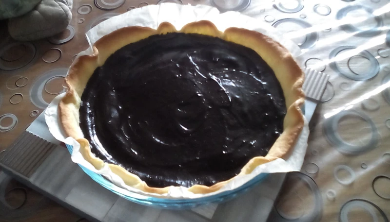 Verser la garniture de chocolat sur la pâte cuite, baisser le four à 100 degrés et enfourner à nouveau pour 10 minutes.