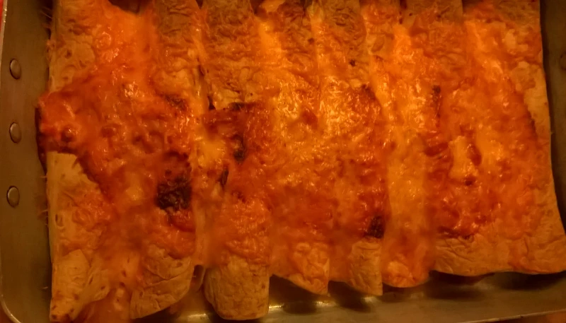 Mettre le poulet dans la sauce et remplir les tortillas en plaçant dans le plat le côté ouvert vers le fond