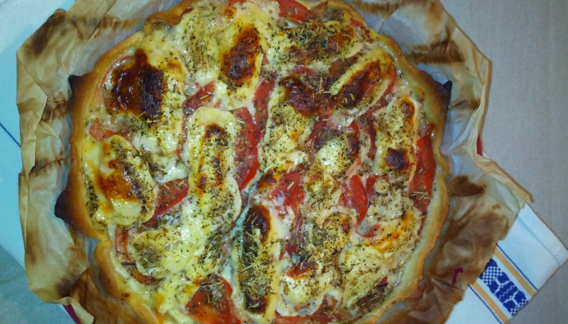 Sorter la pâte du four, tartiner le fond de la tarte avec de la moutarde (2 bonnes cuillères à soupe), recouvrer ensuite avec le poulet, ajouter les tomates au dessus, puis des lamelles de St Marcellin. Saupoudrer de poivre et d'herbes de provences.