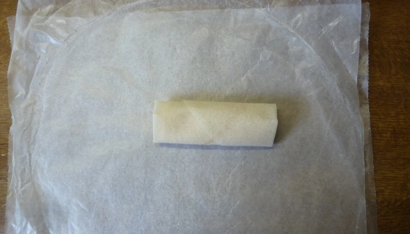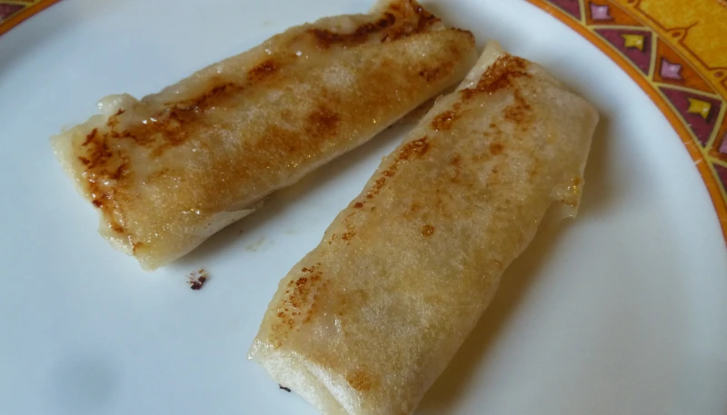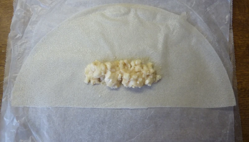Coupez les feuilles de bricks en 2 et déposez la farce au milieu en forme de rectangle et pliez la feuille de bricks de façon à obtenir une forme de nems (voir photos).