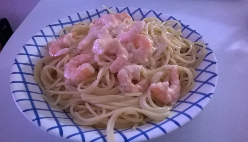 6)Mettre les spaghettis dans une assiette et y verser la crème avec l'ai let les crevettes et ... Dégustez !