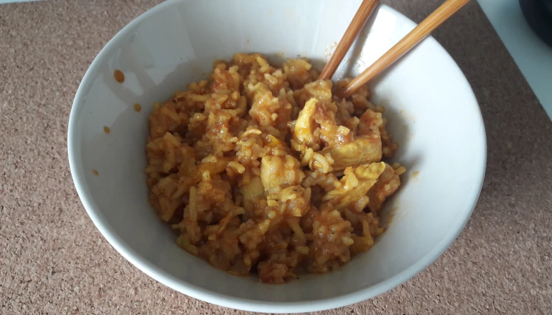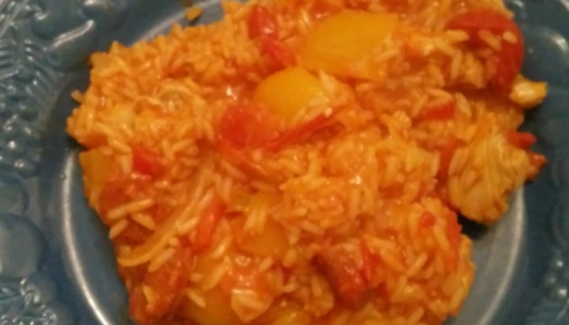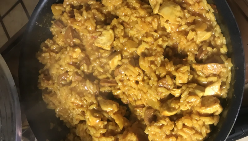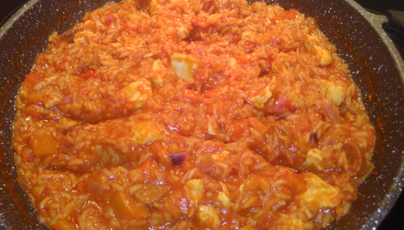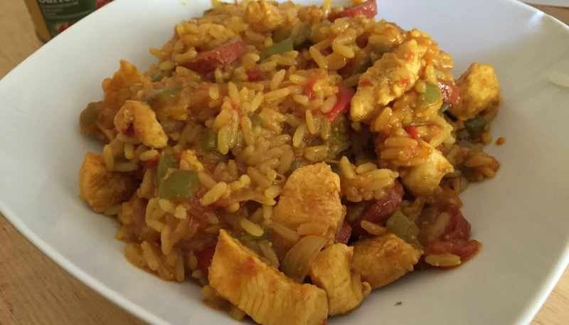 Dans un wok huilé mettre les oignons et les poivrons pendant 5 minutes a feu moyen. Ajouter poulet, chorizo et tomate puis laisser 5 minutes. Ajouter les épices, le riz et verser le bouillon puis couvrir 15-20 minutes en remuant de temps en temps. Rajouter du concentré de tomate mélanger puis servir