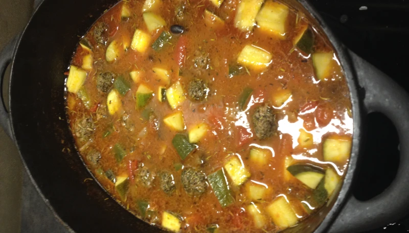 Ajoutez les boulettes de viande et les merguez, laissez cuire entre 5 et 10 minutes .