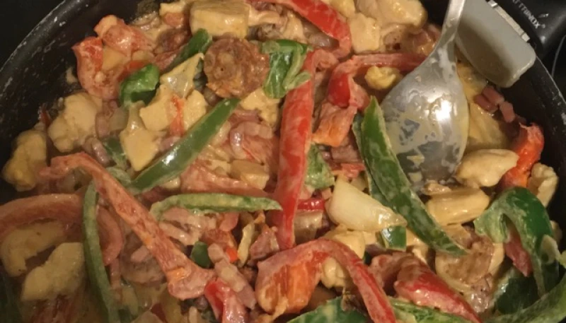 Faire revenir les lardons dans une cocotte ou une grande poêle. Quand ils commencent à dorer, ajouter les oignons et les faire fondre avec les lardons. Une fois les oignons cuits, égoutter le mélanger et le réverver. Essuyer la poêle avec un morceau de papier absorbant et la remettre sur le feu en y ajoutant un filet d'huile d'olive. Faire revenir les filets de poulet et ajouter les poivrons émincés, une fois que le poulet prend de la couleur. Ajouter le mélange oignons-lardons et mélanger.