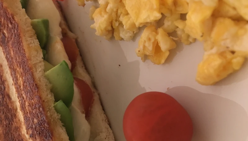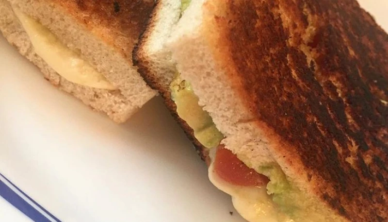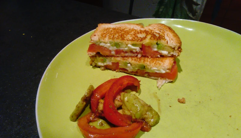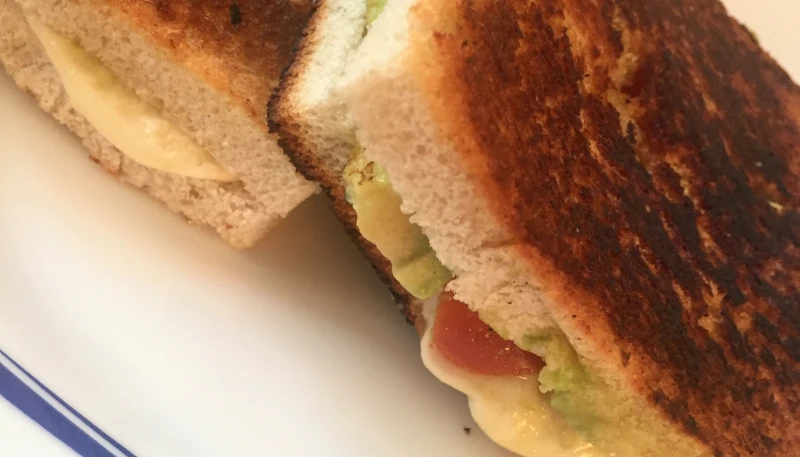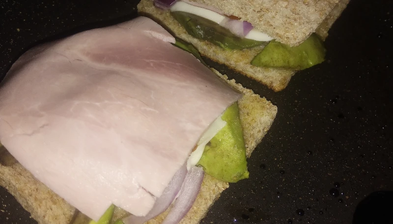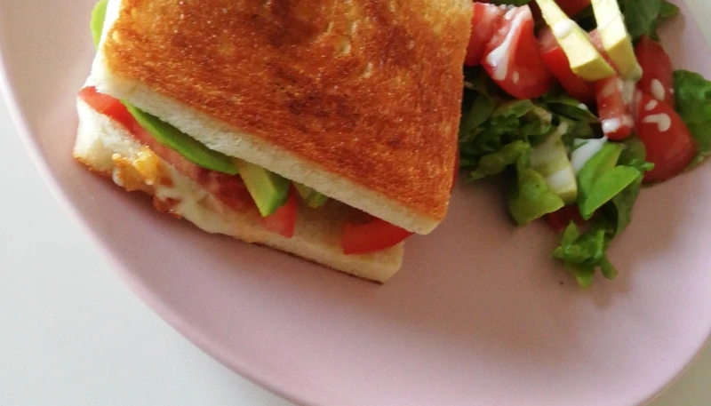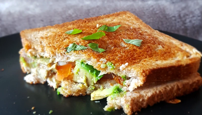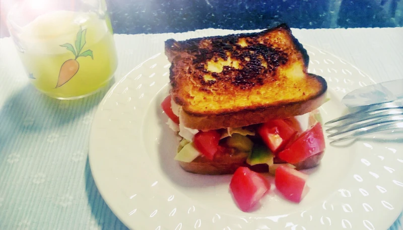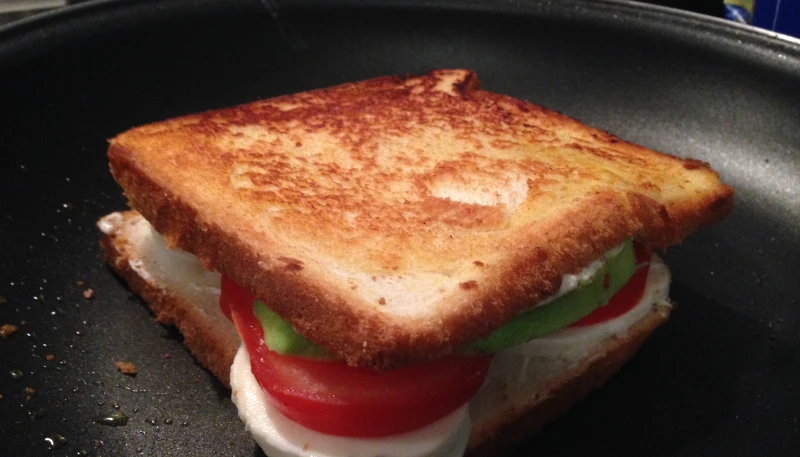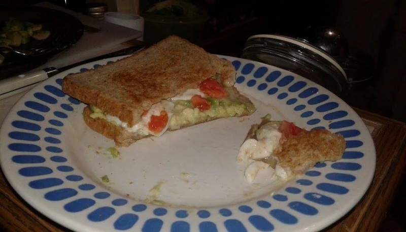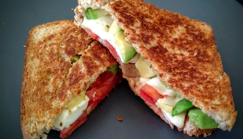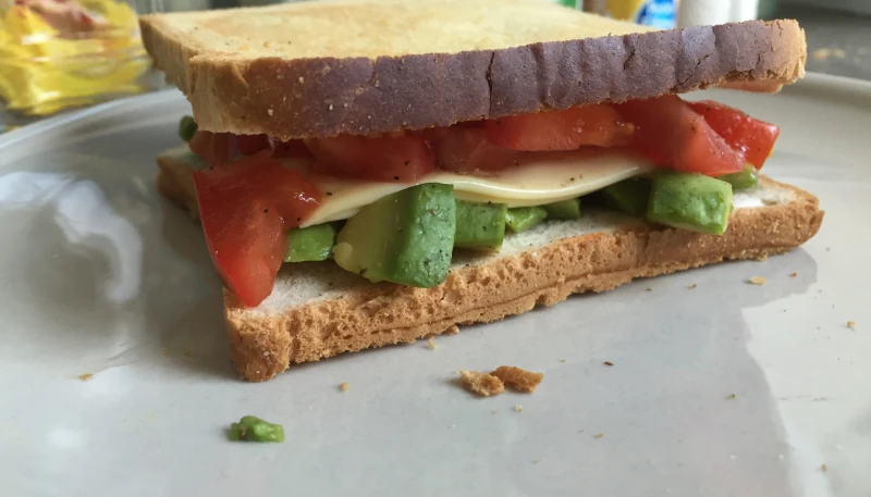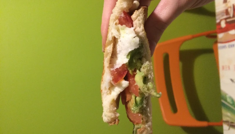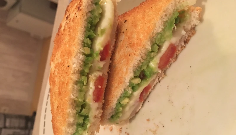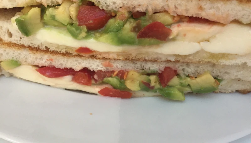 5. Par-dessus, ajoutez l’avocat, la mozzarella et les morceaux de tomate. Versez un peu d’huile d’olive et assaisonnez enfin de sel et de poivre. Refermez le tout avec l'autre tranche