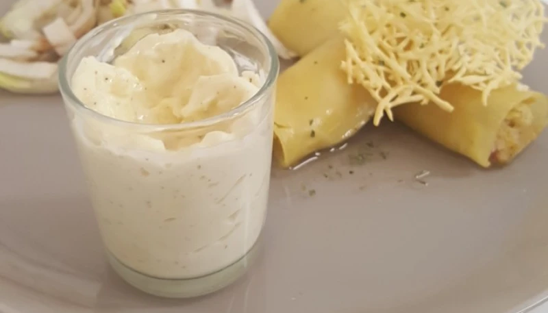 - Vous pouvez également l'accompagner d'une sauce à base de vache Kiri, un peu de lait, sel, poivre et d'une tuile de gruyère pour la décoration
