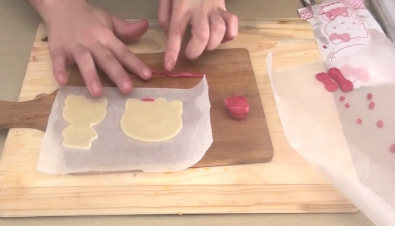 Étaler de la pâte d’amande blanche et former avec les emportes pièce la forme hello kitty, coloré une partie de la pâte d’amande avec le rouge sans en mettre beaucoup pour obtenir plutôt un rose, puis amusé vous à faire comme sur les photos ou dans la vidéo les diffèrent trait hello kitty, puis conserver cela au frigo