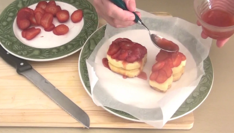 Sur le biscuit pausé la crème pâtissier, mettre ensuite les fraises sur la crème, mettez alors la compoté de fraise, puis pausé délicatement nos création en pâte d’amande sur le dessus, et voilà le tour et jouer.