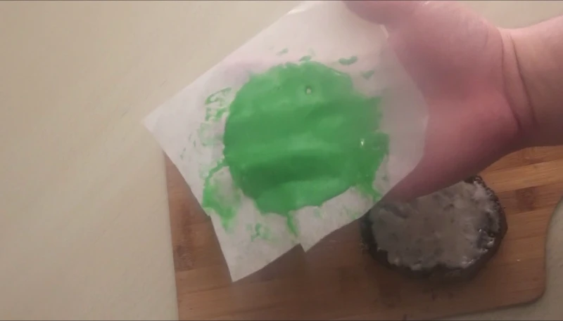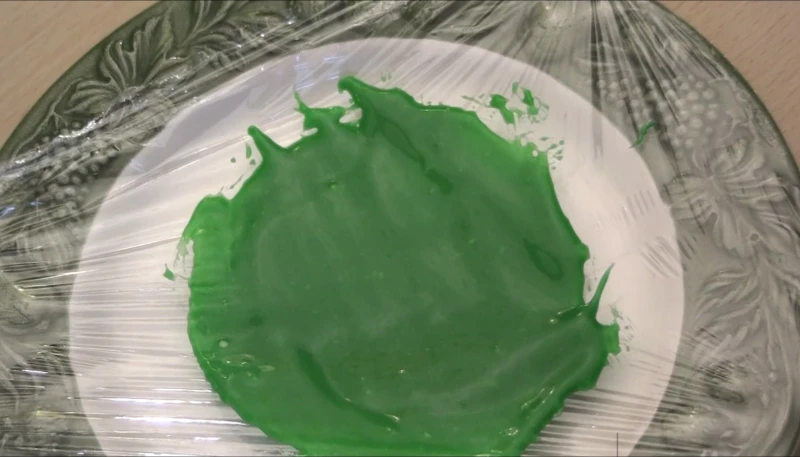 - Colorez l'autre partie du chocolat blanc en vert, étalez-le sur une assiette ou un plat filmé, cela servira à imiter la salade.