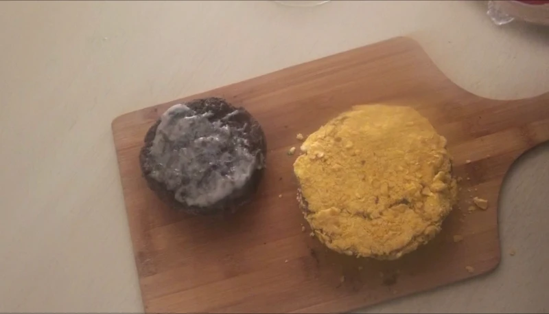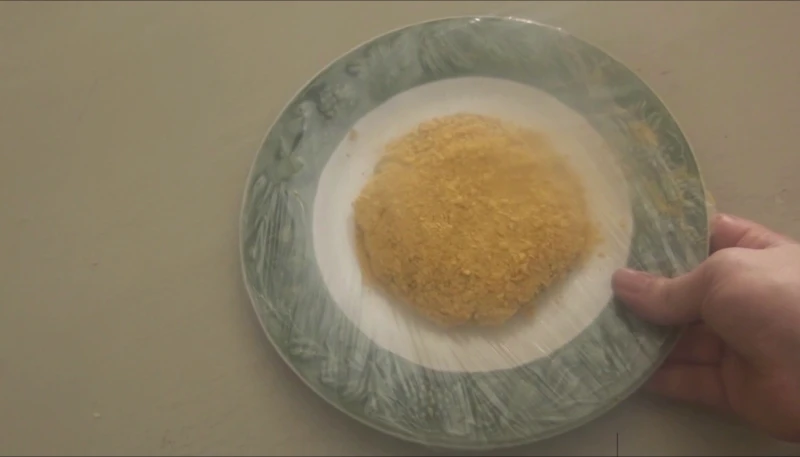 - Une fois le chocolat blanc bien pris, posez votre steak de fraise dessus, entourez bien le steak, puis ensuite concassez finement des Corn flakes et panez celui-ci avec.