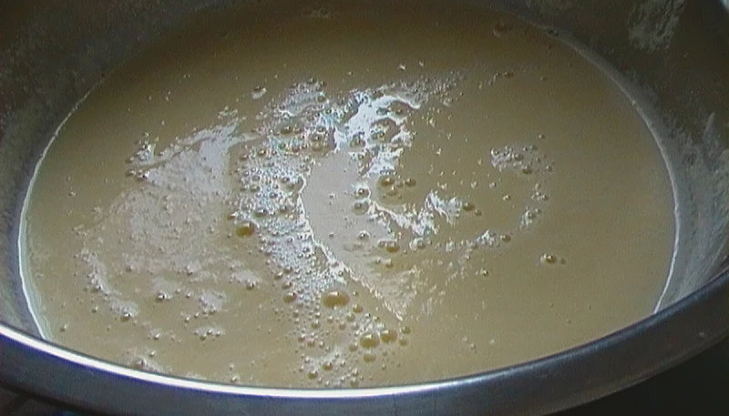Lorsque le lait boue, mettre une passoire fine au dessus du mélange sucre/œufs pour récupérer la gousse et les graines. Versez 1/3 du lait . Fouettez vivement, puis ajouter le reste du lait chaud.