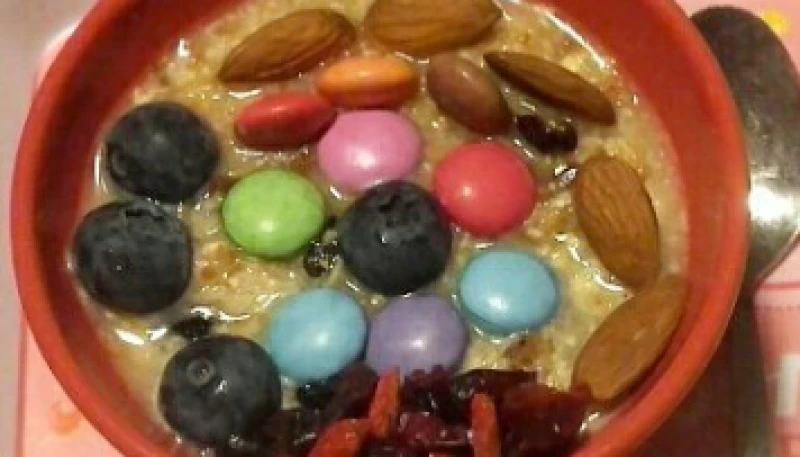 Ensuite on peut rajouter des fruits frais de saison, des fruits secs, du beurre de cacahuète , de la pâte à tartiner ou 1 voir 2 carré de chocolat de votre choix !