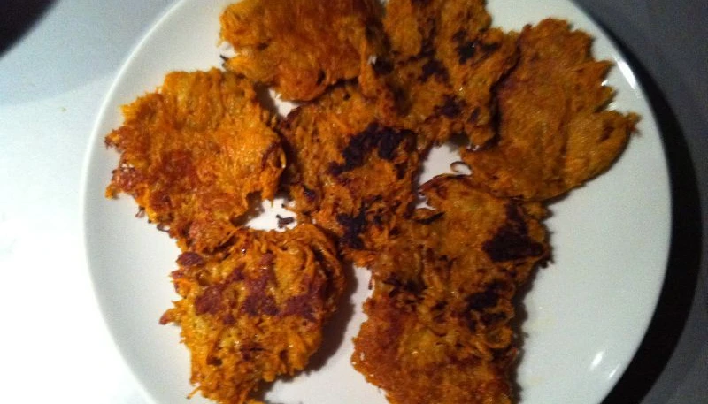 rapez les carottes dans un saladier, puis ajoutez 50G de Farine, un oeuf, puis tailler en brunoise les deux oignons et echalottes, remuez le tout et ajouter une pincée de curry et à l'aide d'une cueillere, deposer les rosti ds une poelle huilée au préalable, retournez chaque galette jusqu'elles soient bien dorées. BON APPETIT!