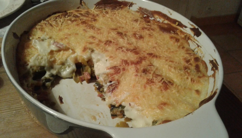 Dans votre plat, mélangez les lardons, les poireaux et recouvrez avec la béchamel. Rajoutez du fromage râpé à votre convenance.