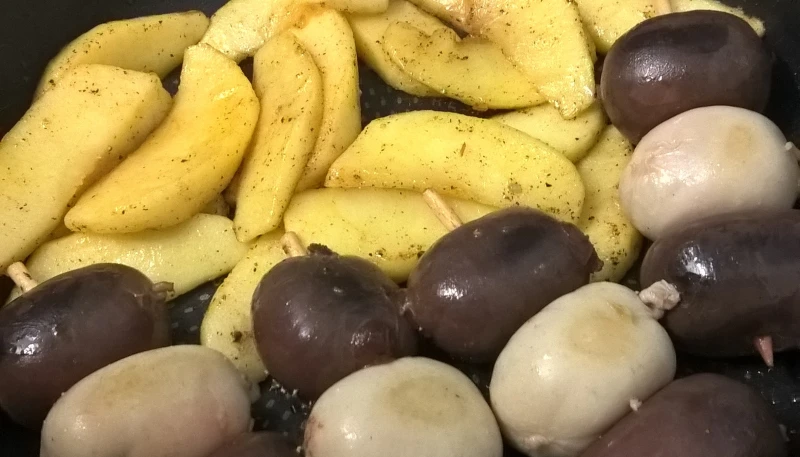 Entre 5-10 minutes avant la fin de la cuisson des pommes y rajouté un ou plusieurs boudin (noir de préférence , le blanc est bon aussi avec des pommes, si non j'ai acheté les petites brochettes comme sur la photo chez un discounter au logo jaune et bleu (je ne sais pas si j'ai le droit de dire le nom)). Je le met dans la même poêle pour faire le moins de vaisselle possible.