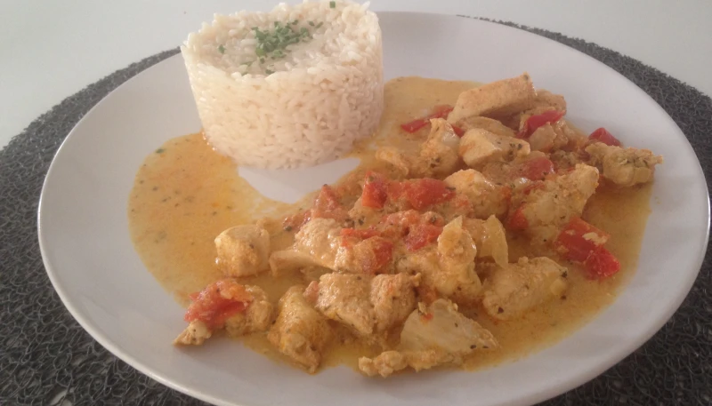 4/ Dès que le poulet et les poivrons sont cuits, ajoutez la crème fraîche, le curry, sel, poivre et des épices selon les goûts ( piment, paprika, cumin , persil...)