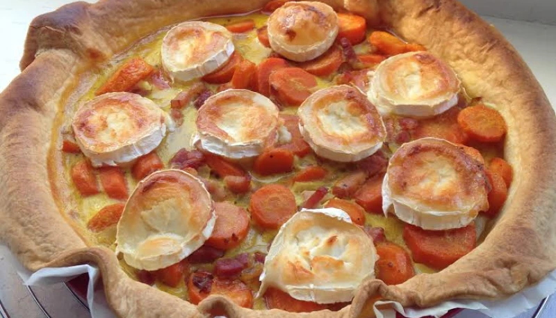 Dans le saladier, mélanger les oeufs, la crème, le sel et le poivre. Y ajouter le mélange carottes/lardons encore chaud. Mettre le tout dans la pâte puis y ajouter des rondelles de chèvre par dessus.