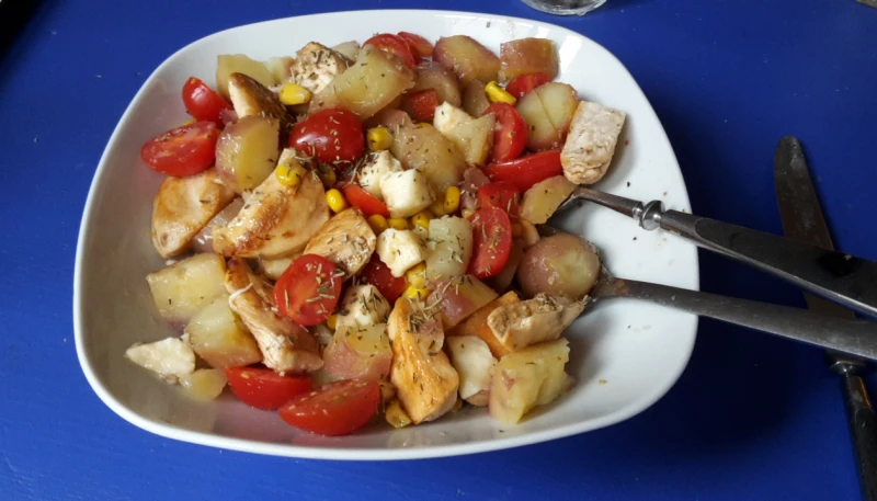 Mettre tous les ingrédients dans une assiette creuse (pomme de terre, tomates, poivron, maïs, escalopes, mozzarella, vinaigrette), mélanger et voilà c'est prêt !