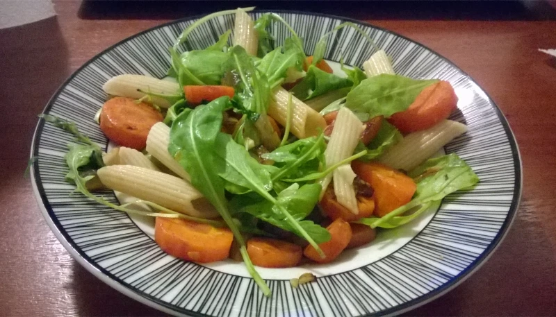 *Rajouter la carotte couper en rondelles et les pâtes dans la poêle, rajouter de la sauce soja. Laisser mijoter pendant 5 minutes en remuant de temps en temps
