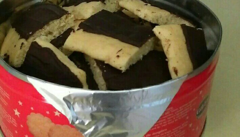 3/ Faire fondre le chocolat au micro-ondes ou au bain-marie. Recouvrir à l'aide d'un pinceau la moitié sablée visible (& non pas le dessous) avec le chocolat. Laisser refroidir & placer au frais.